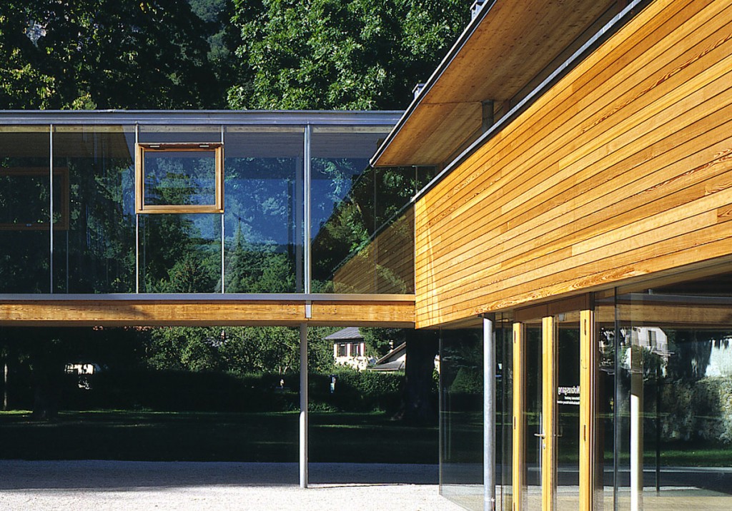 Der neue Saal ist als introvertierter Baukörper mit freiem Blick in die umgebende Landschaft konzipiert. Als Holz-Glas-Konstruktion, die in die alte Baustruktur hineingesetzt ist, verbindet er räumlich den Bereich des Schlossparks und den ehemaligen Wirtschaftshof. Konstruktiv ist es eine Holzleimkonstruktion auf Wandscheiben und Stahlstützen. Der lange, verglaste Verbindungsgang ist ebenfalls eine tragende Holzleimkonstruktion.